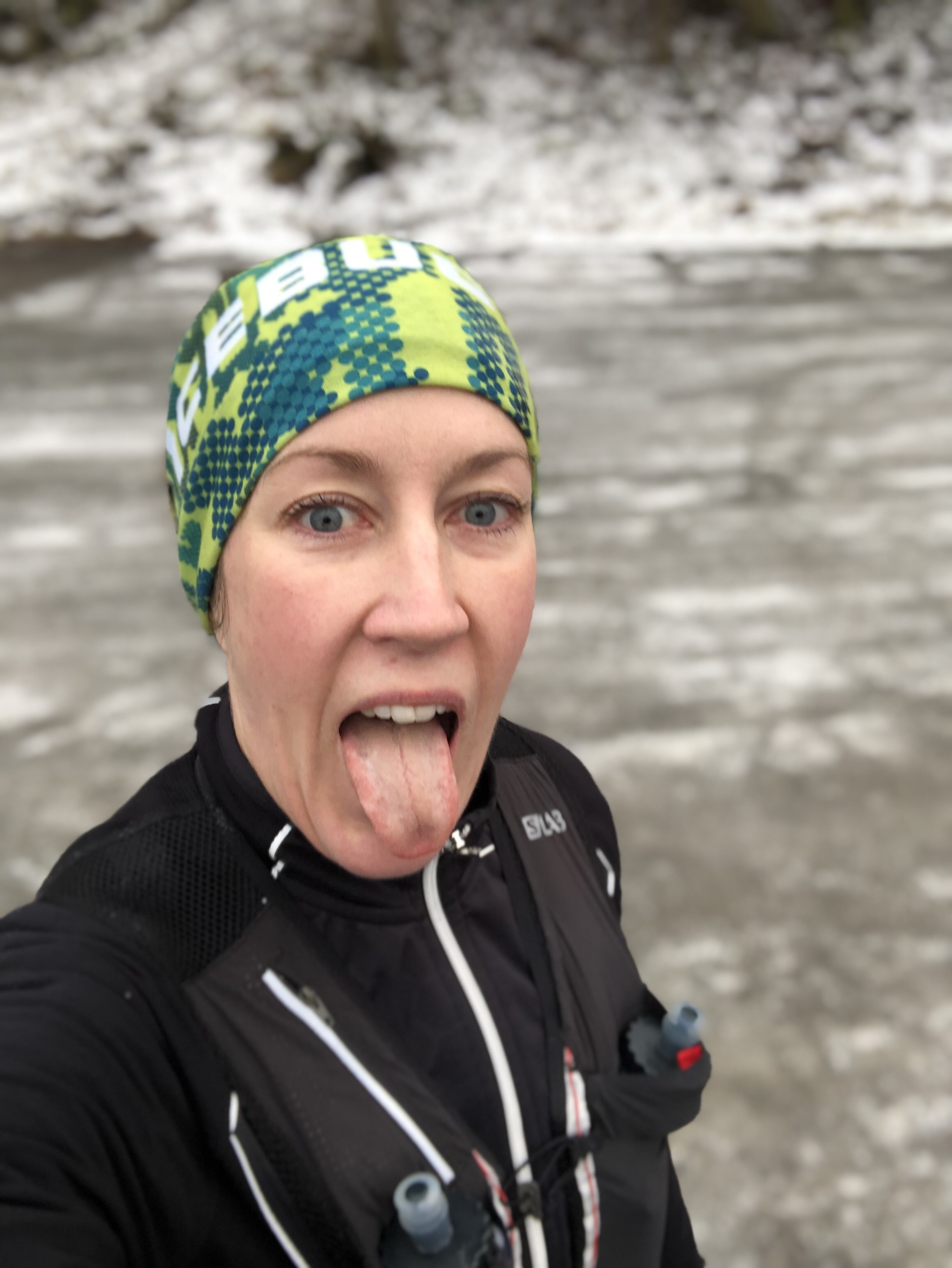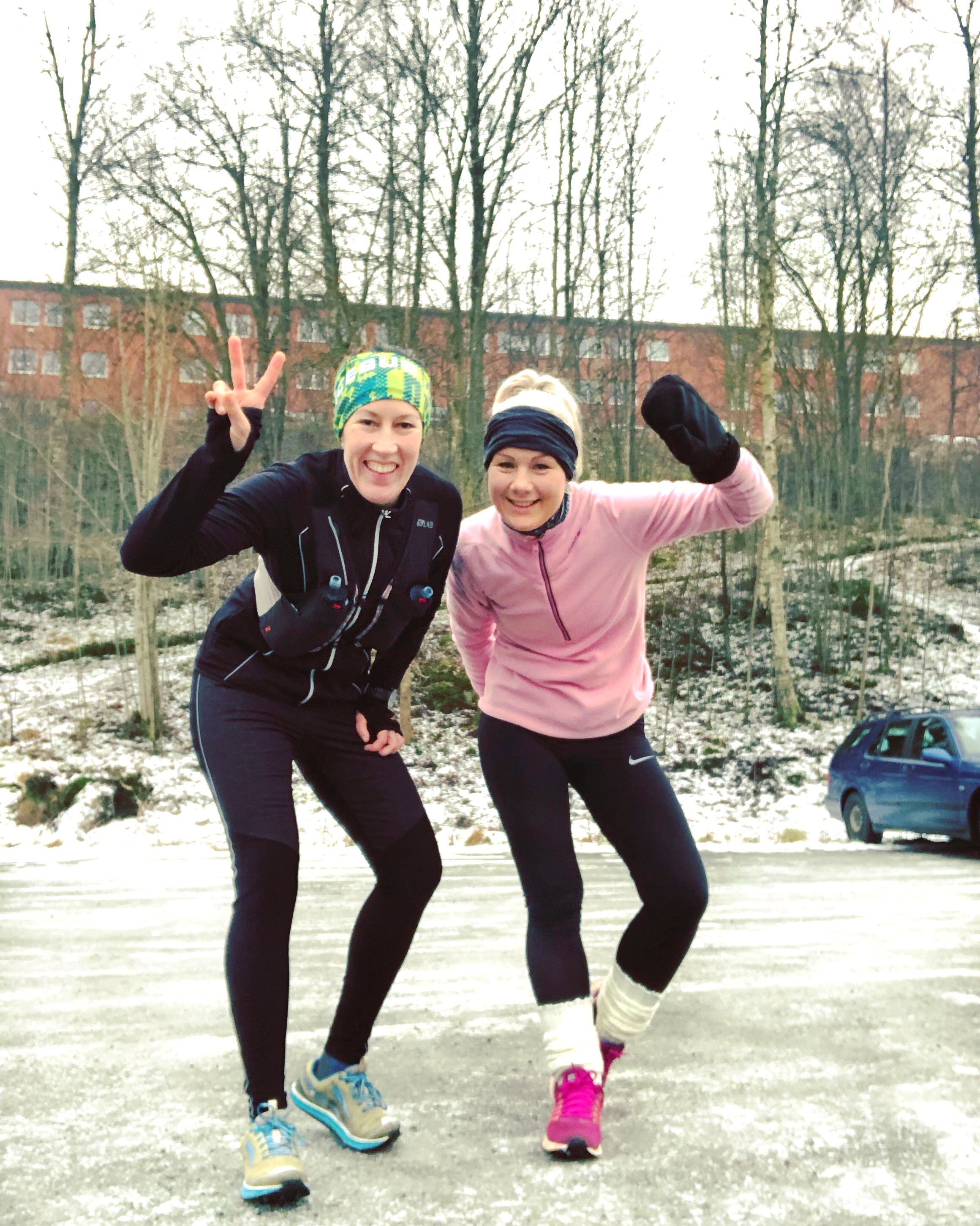 Vi stämde träff på Kransmossen, gav oss iväg. Upp i skogen och in till isen. Det var vansinnigt halt och isigt och vi fick lov att gå på många håll. Massa fniss och många oh! när fötterna gled iväg. Efter 10 km skogsslir kom vi ut på asfalt och med stadslöp och jag trodde att det skulle bli bättre underlag men tji fick jag. Det var härlig svartis på asfalten och fötterna bara slant iväg i frånskjutet. Jag började känna mej lite sliten i kroppen när vi närmade oss 20 km, mycket för att jag spände mej mycket när jag sprang. Benen, ljumskarna och axlarna var superstela men vi hade en bit kvar så det var bara att bita i.