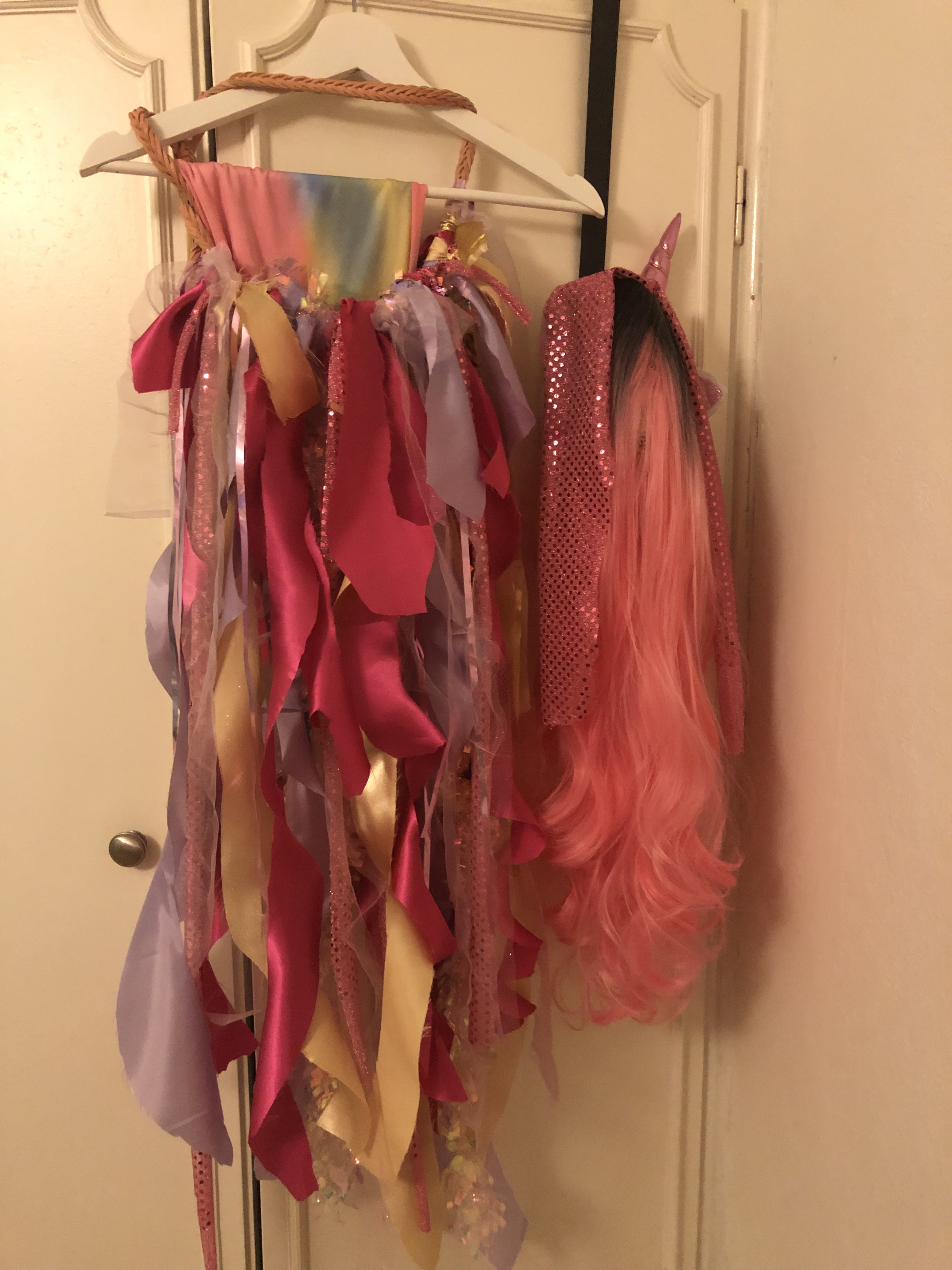 Vi delade på en pizza ( japp, jag äter sån mat ) och plockade fram en massa tyger, saxar och glittrande saker och gick loss på vårt lilla projekt. Vi fnissade, klippte, knöt och fick hela köket att glittra innan vi vart klara.
