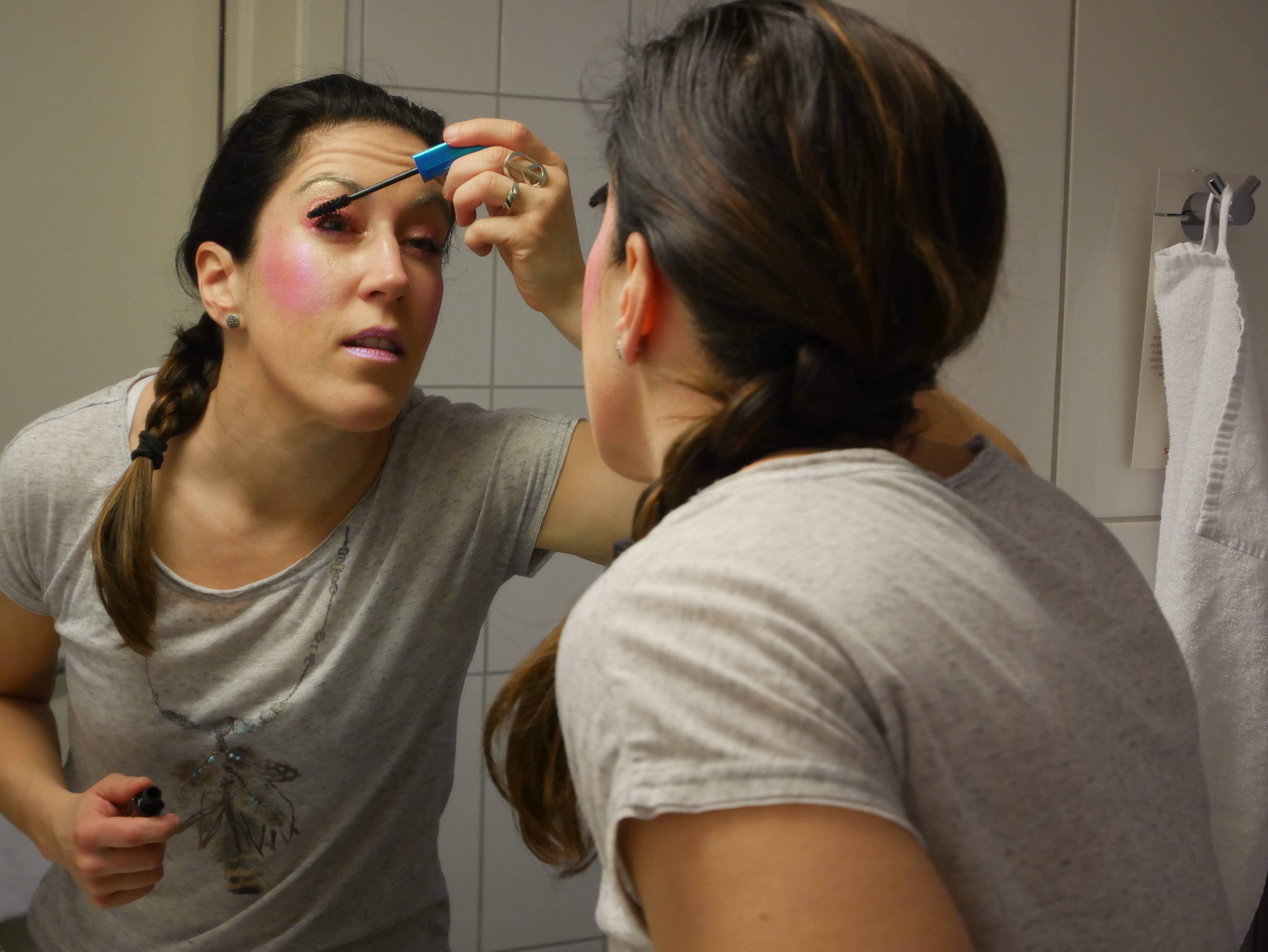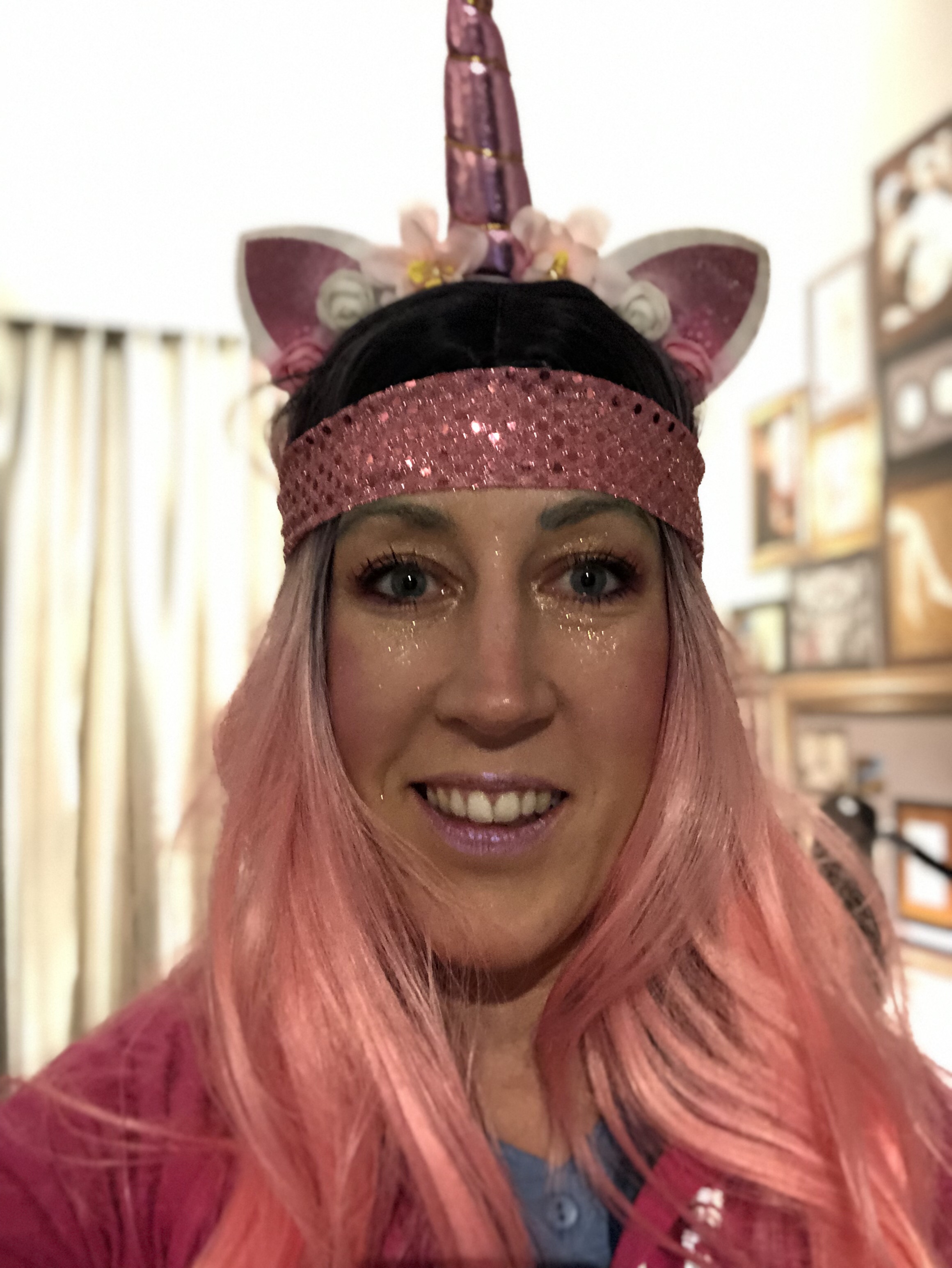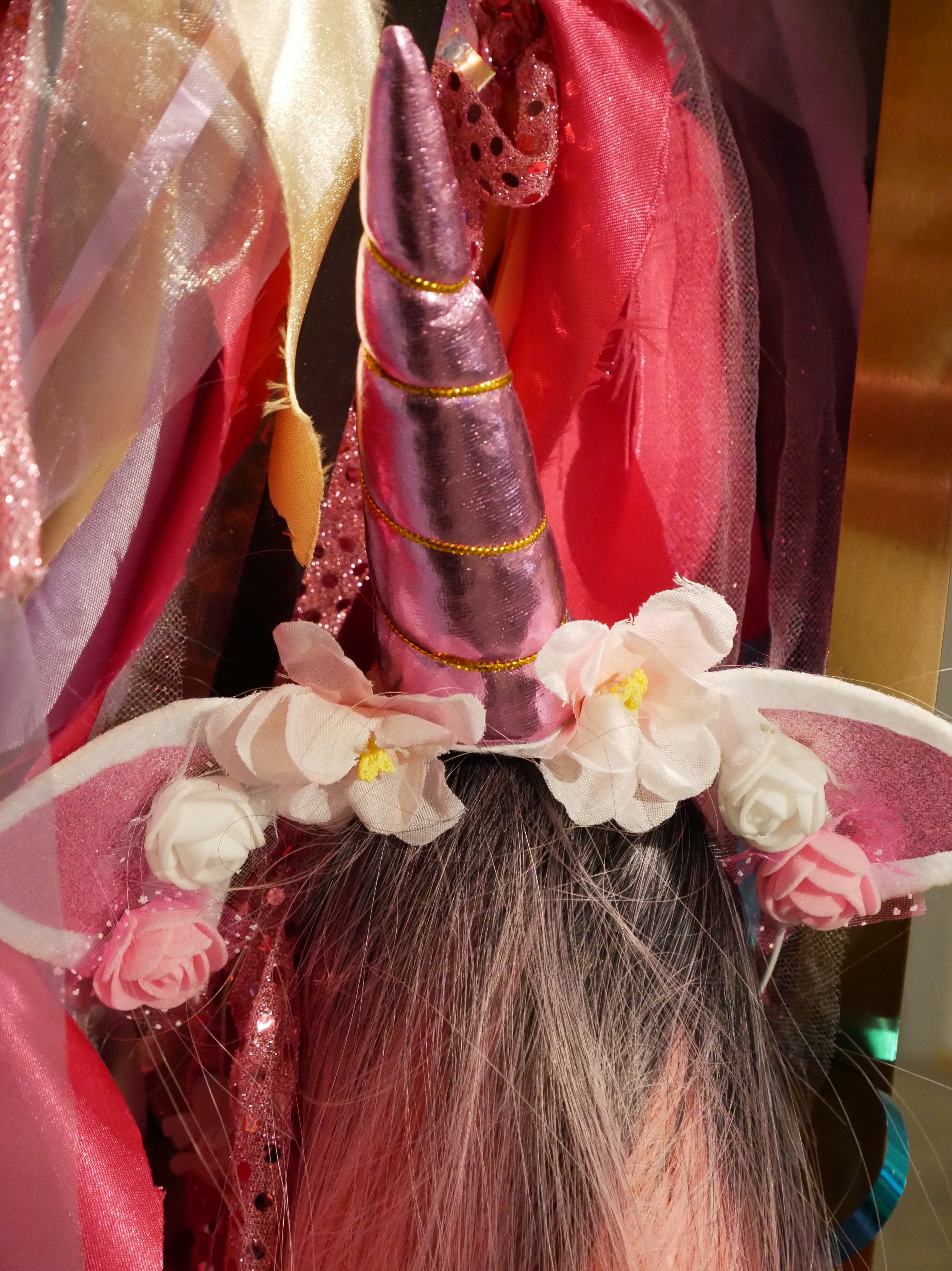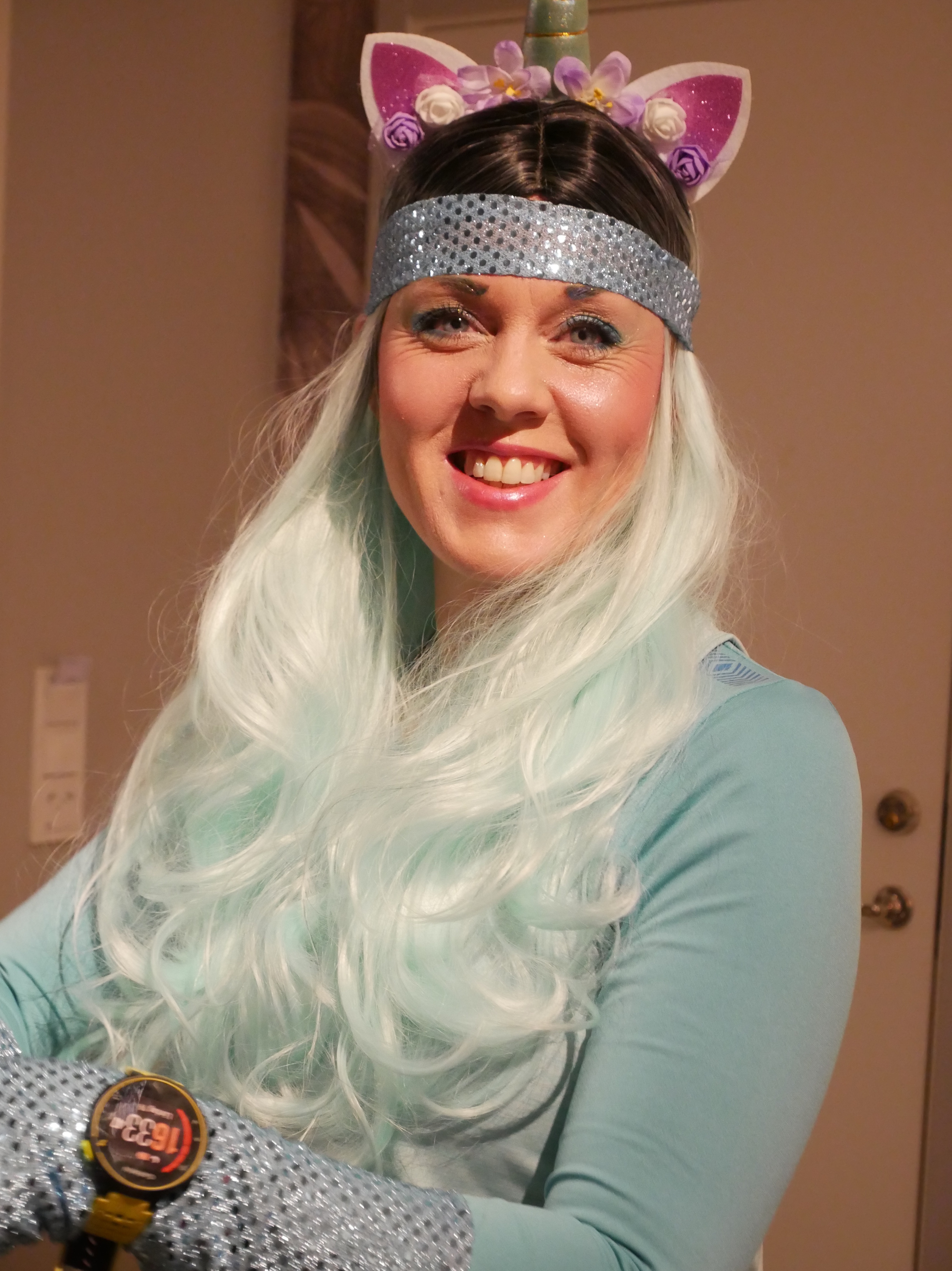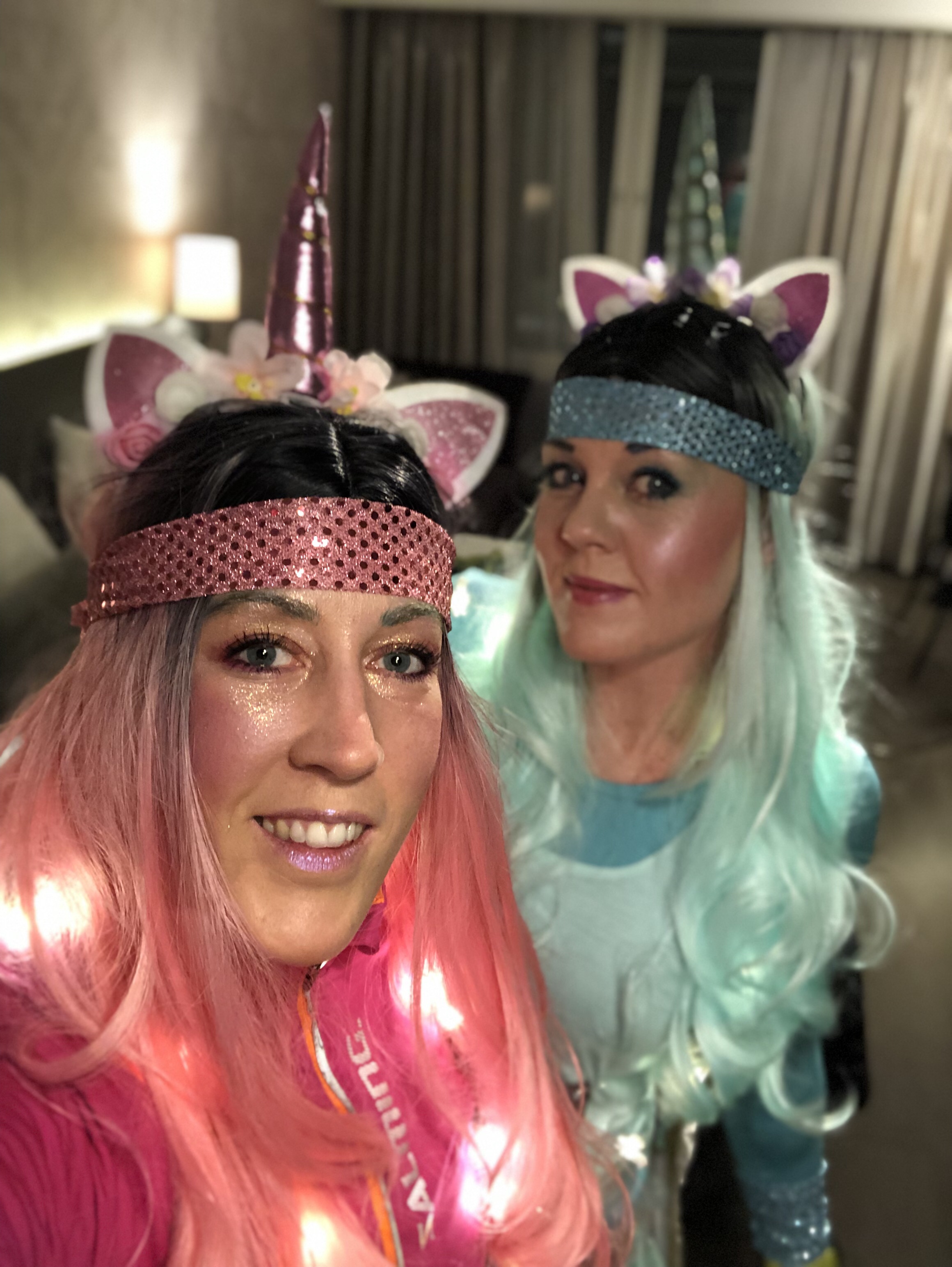 Och vilken kväll vi fick! Vi susade in på vårt hotell och började vår förvandling till magiska enhörningar som bara skulle sprida glädje och fnitter. Och jag blev så galet nöjd över våra outfits! Massor av färg, glitter och fladdrande saker.