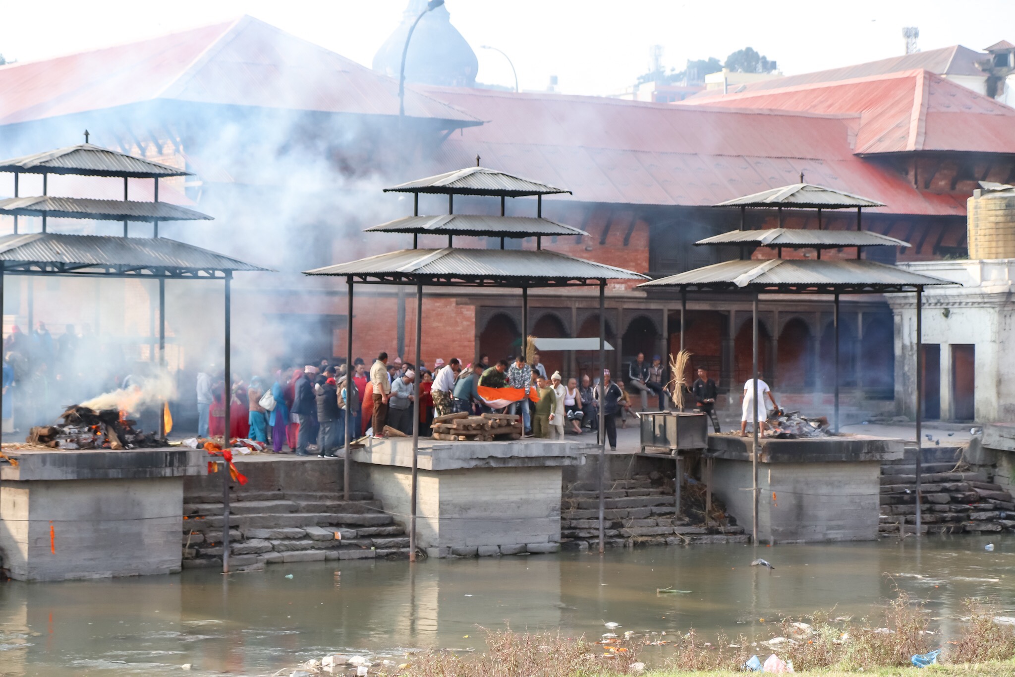 Efter lunchen i Patan åkte vill tillbaka till Katmandu och besökte Pashupatinath Temple, ett av de viktigaste hinduiska templen i Nepal. Väl på plats fick vi bevittna hinduiska begravningar där de brände de döda kropparna på bål och svepte sedan ner askan i floden, som är en biflod till Gangnes och på så sätt helig. Att bevittna hur de bar fram kroppar, la dem på bålet och sedan tände eld var både makabert och fascinerande. I våra ögon ganska obehagligt men samtidigt helt naturligt. Vi kremerar ju med kroppar, men inte så publikt. Det var ändå intressant att höra om hur deras traditioner går till och hur de ser på att en kropp som ” brinner snabbt ” tillhörde en god människa medan en kropp som tog längre tid tillhörde en mindre god människa.