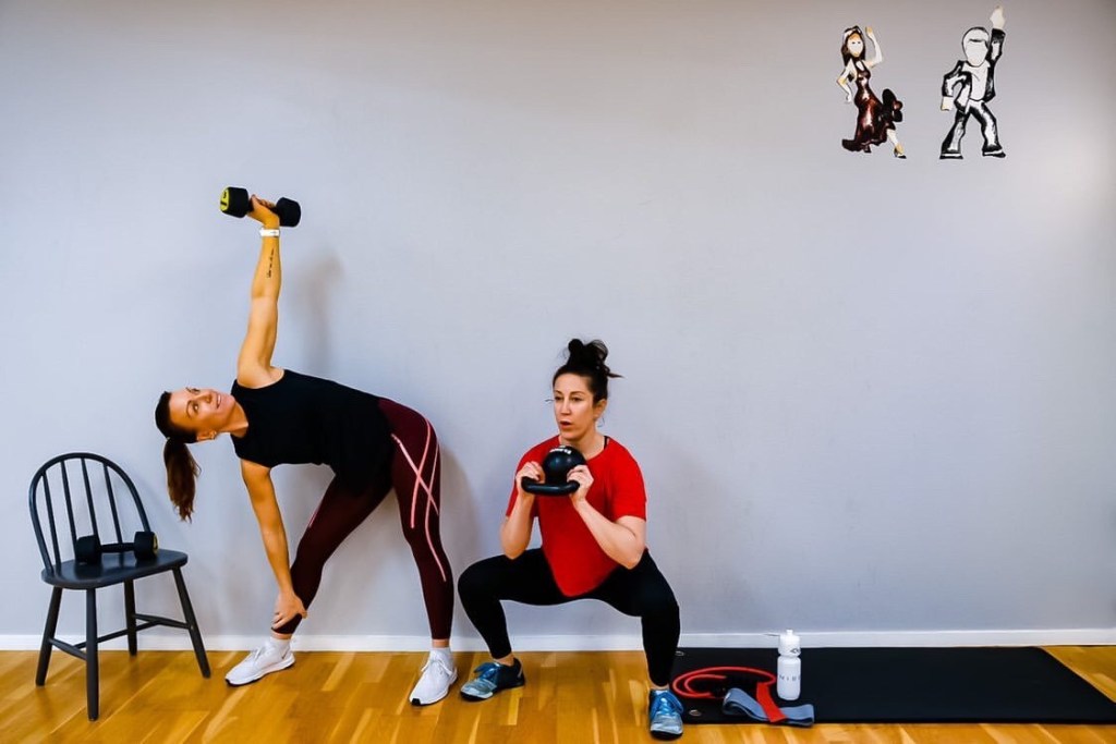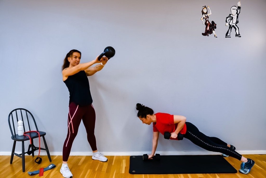 Du får tre pass i veckan. Ett funktionellt pass ( det är lite flåsigare och mer cirkelbaserat), ett lugnare bål- och rörlighetspass och ett mer traditionellt styrkepass.